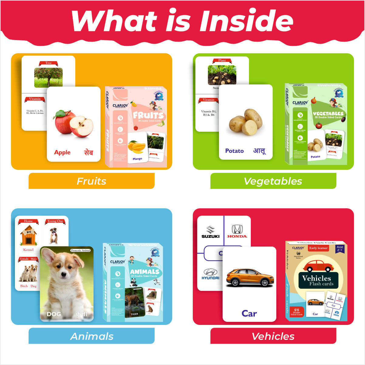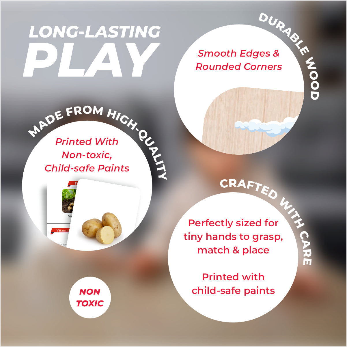 Introduce your little one to a fun, interactive, and educational world with the Clapjoy Animal, Fruit, Vegetable & Vehicle Wooden Educational Tray and Flash Cards Combo! Specially designed for toddlers and preschoolers, this vibrant learning set makes early education playful and engaging while promoting cognitive, motor, and memory skills.