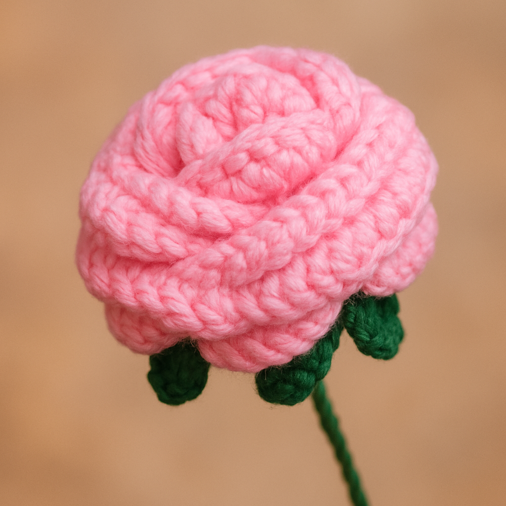 Transform any space with this exquisite handcrafted crochet rose, meticulously created with pink yarn and adorned with realistic green leaves and stem. Each delicate petal is carefully crafted to capture the timeless beauty of a blooming rose, making it a perfect永lasting alternative to fresh flowers. The intricate stitching showcases remarkable attention to detail, from the layered petals that spiral inward to the textured leaves that complete this botanical masterpiece. This decorative piece adds a romantic touch to home decor, makes a thoughtful gift, or serves as a unique accent for special occasions. Unlike real roses, this artisanal creation maintains its vibrant color and perfect form year-round, requiring no maintenance while continuing to charm with its handmade appeal.