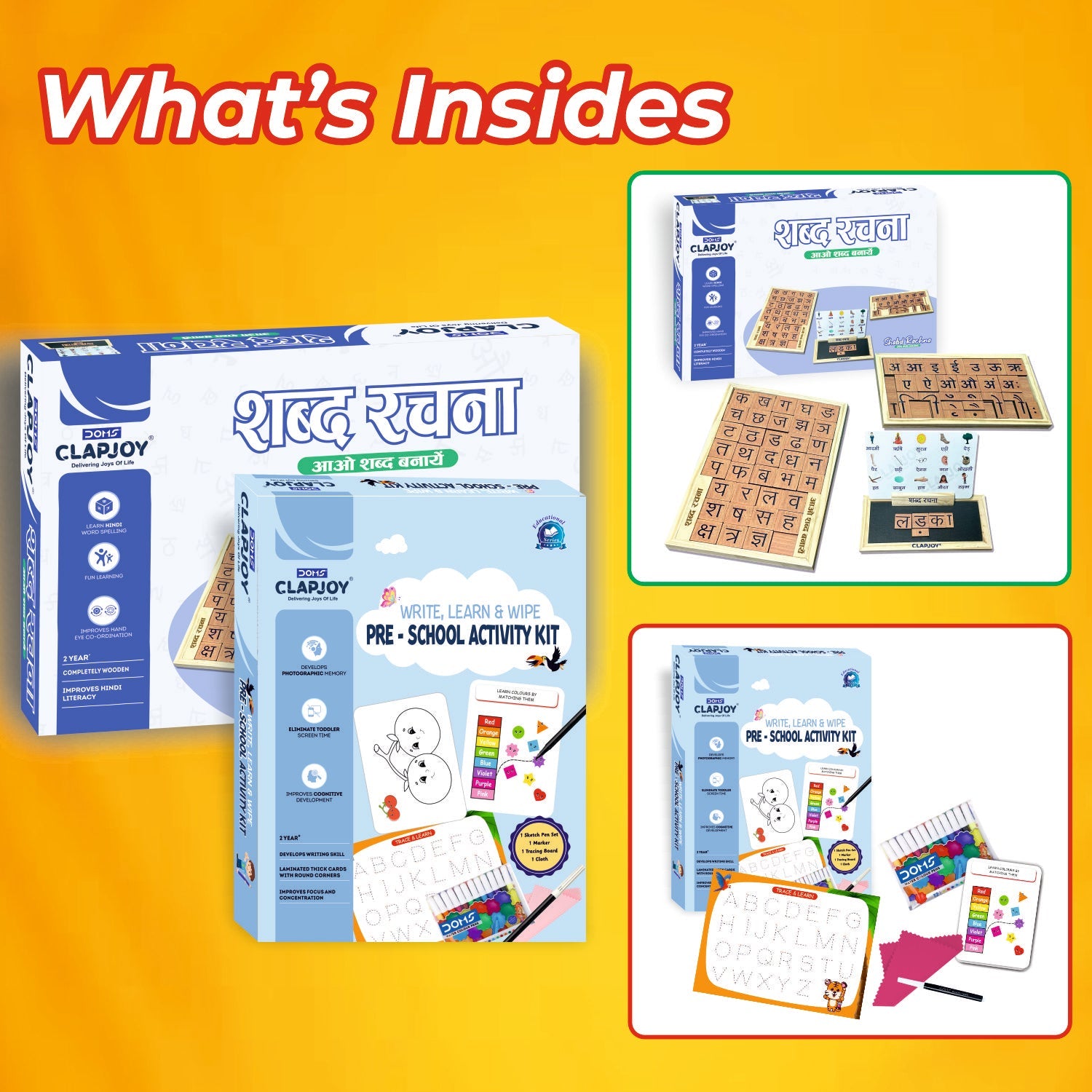 Give your little one a head start in language and early learning with the Clapjoy Pre-School Activity Kit Combo, specially designed for curious young minds. This value-packed combo features 72 Double-Sided Flash Cards and an engaging Wooden Shabd Rachna (Word Formation) Game, thoughtfully created to promote Hindi language skills, cognitive development, and early concept recognition.