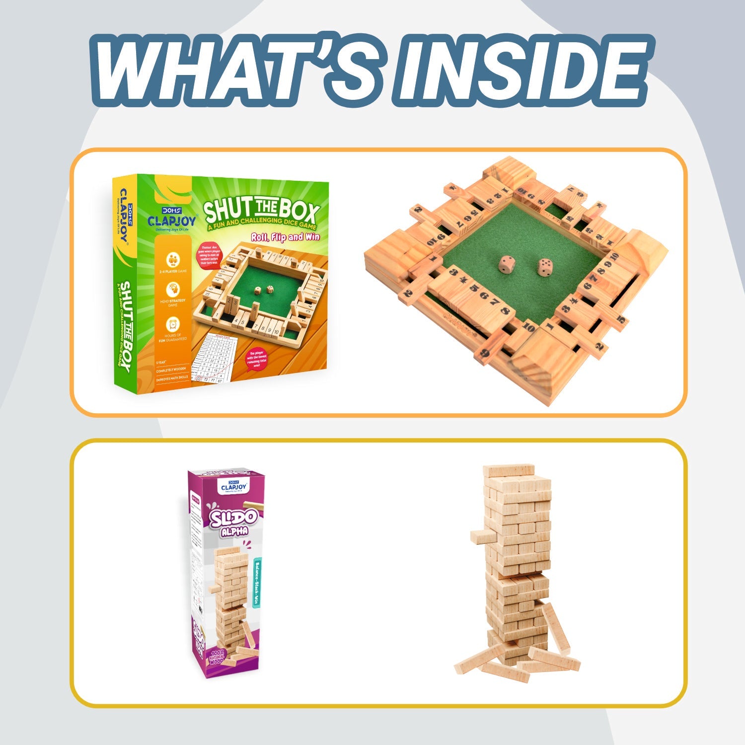 Bring home double the fun and learning with the Clapjoy Shut the Box and Slido Alpha Combo — a classic combination of two engaging and interactive wooden board games designed for kids and adults alike! Whether it’s a fun family game night, a party challenge, or a brain-teasing session for young learners, this combo offers hours of entertainment while boosting important skills.