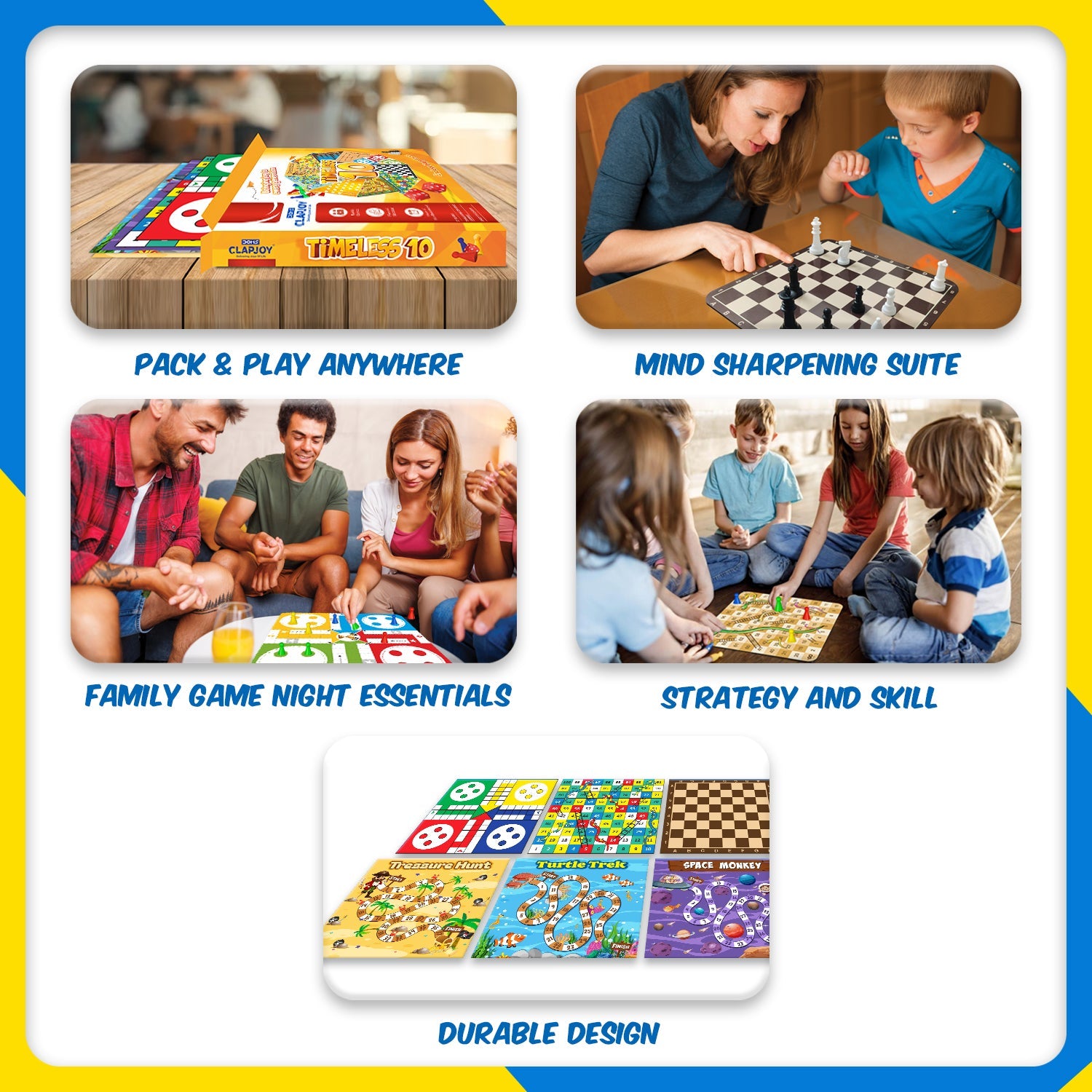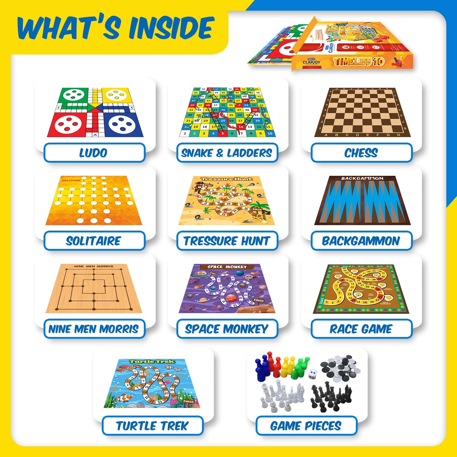 Clapjoy Timeless 10 is a delightful board game collection that brings together 10 iconic games in one compact, travel-friendly package. Featuring favorites like Chess, Ludo, Snake & Ladder, Solitaire, Backgammon, Nine Men Morris, Drive Your Car, Travel Game, Treasure Hunt, and Track Game, this set is designed to engage both kids and adults for hours of educational and strategic fun.