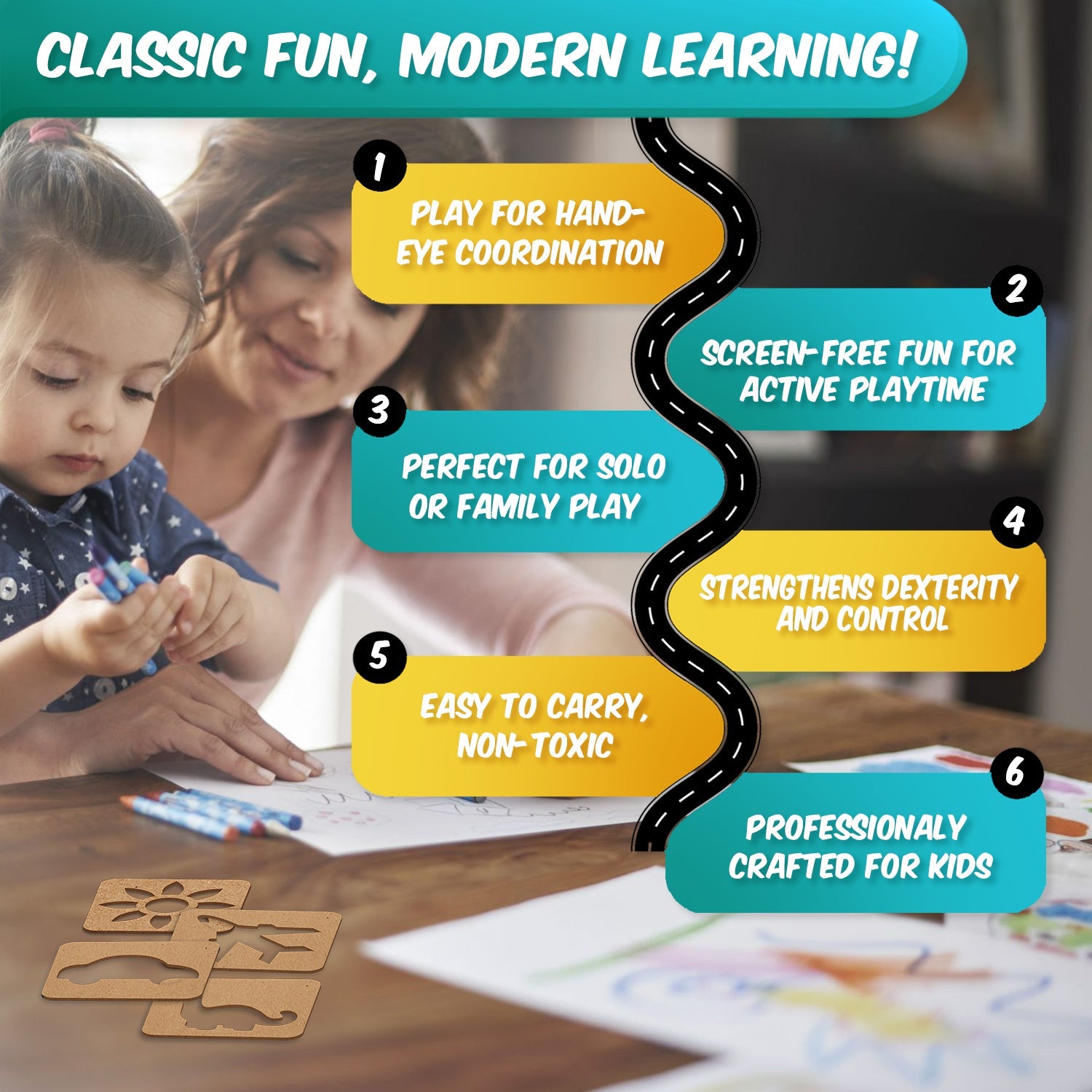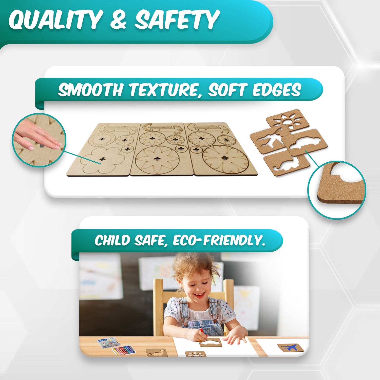 Both the spinning top and painting stencil activities are carefully curated to boost early childhood development. While the spinning top improves concentration and fine motor control, the stencil boards promote color recognition, spatial awareness, and pattern understanding. Together, they provide a holistic learning experience suitable for toddlers, preschoolers, and kindergarten kids aged 3 years and up.