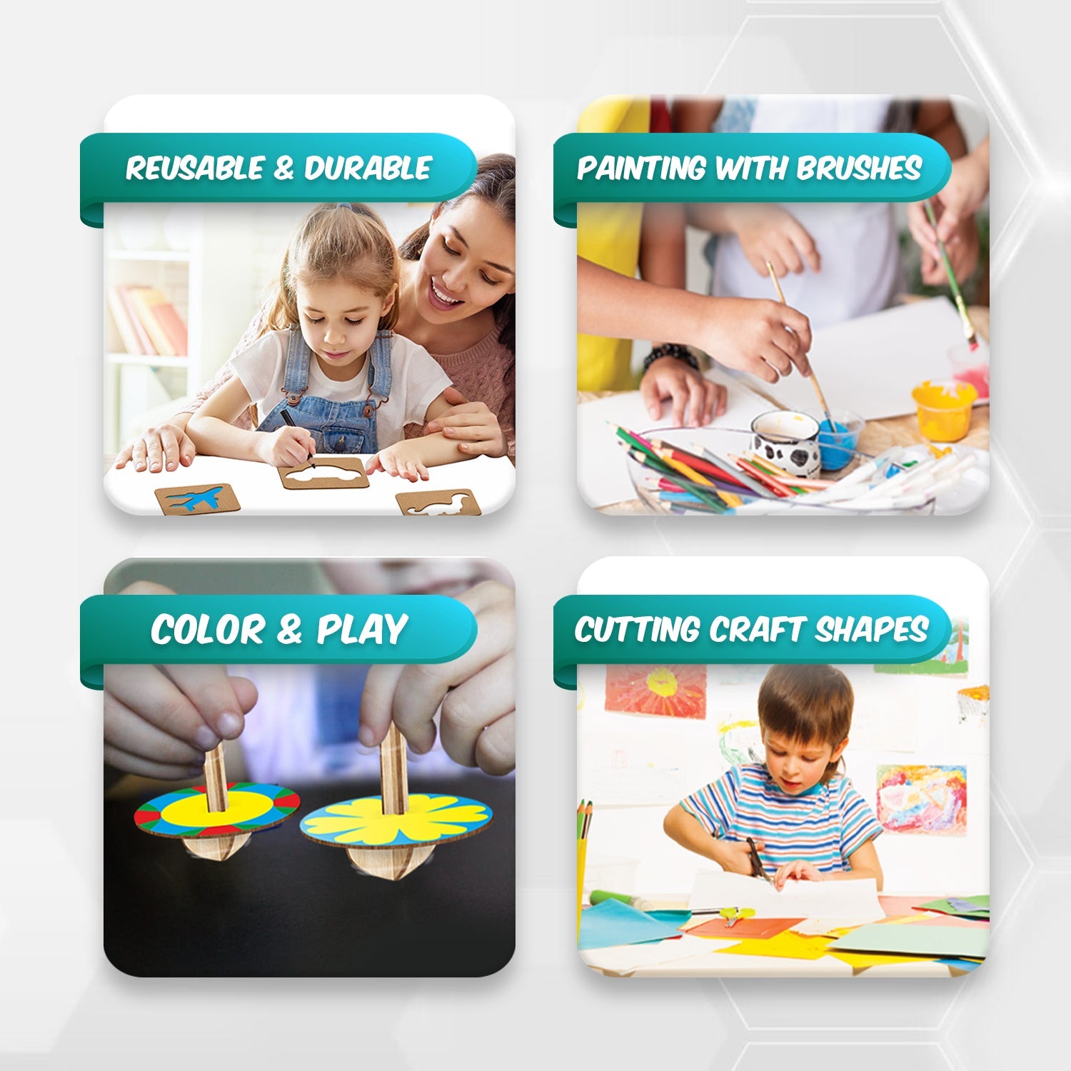 Complementing the spinning top is a set of 20 reusable wooden painting stencil boards featuring kid-friendly themes like animals, fruits, vehicles, flowers, alphabets, and everyday objects. Each stencil is made from durable wood with smooth, rounded edges for safe handling. Perfect for tracing, coloring, and art activities, these stencils help children enhance their creativity, grip control, color recognition, and shape identification.