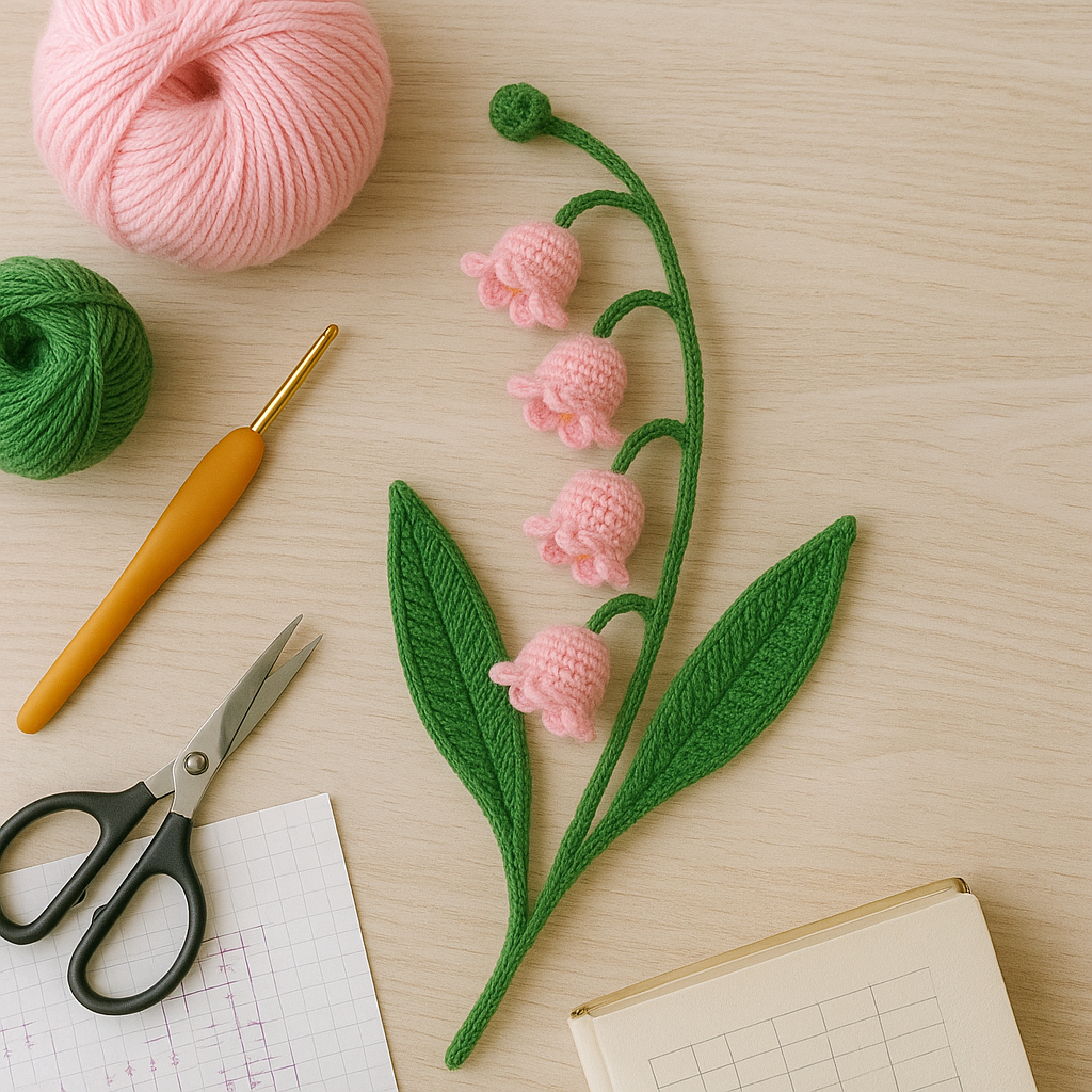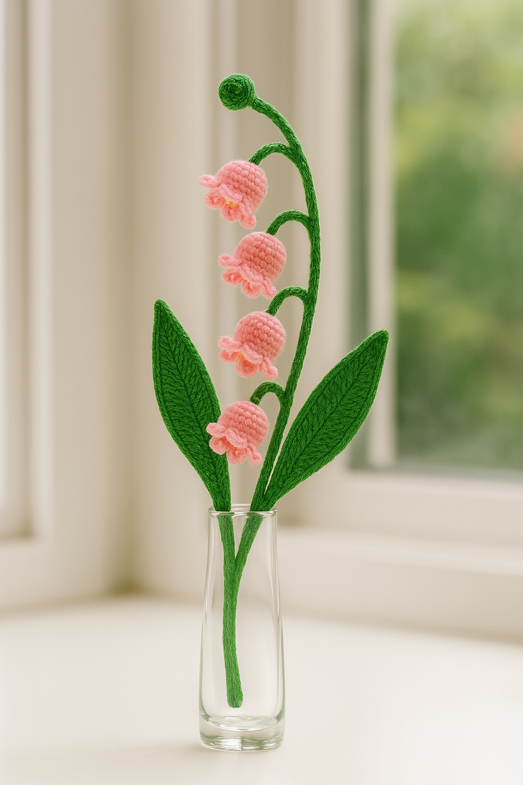 Add a touch of handcrafted beauty to your space with this crochet Lily of the Valley-inspired wool flower. Featuring four delicately stitched pink bell blooms, two detailed green leaves, and a sturdy yet flexible green stem, this crochet stem captures the essence of spring with warmth and style.