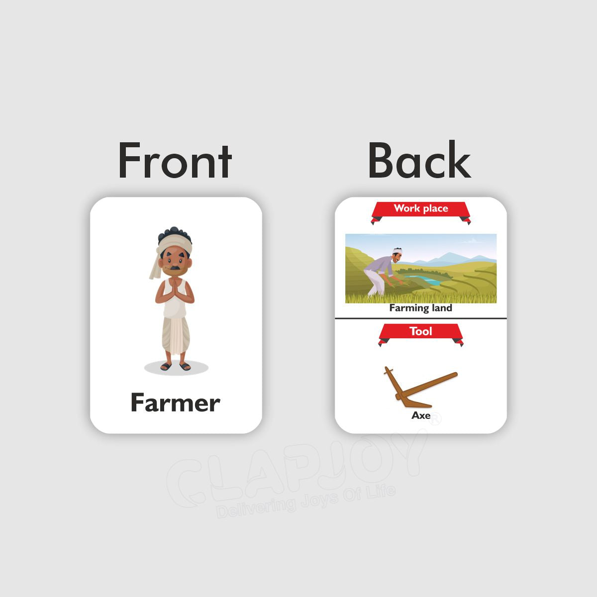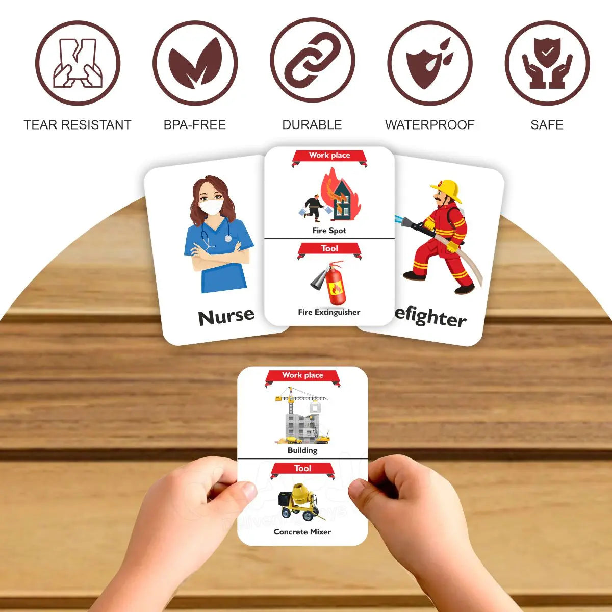 Each card is designed with realistic illustrations and features valuable details on the back, such as associated tools, workplaces, and brand logos. Crafted with tear-proof and waterproof material, the cards are safe and easy to handle for children aged 2 and up. A perfect blend of learning and play for curious minds.